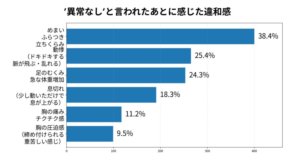- 異常なしと言われた後も違和感を経験:めまい38.4%、動悸25.4%、むくみ24.3%
